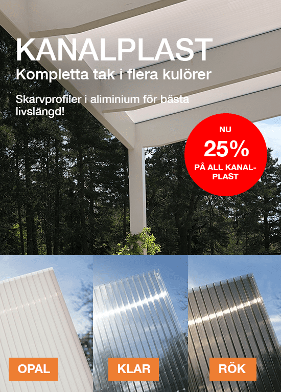 Hos oss hittar du kanalplast i flera tjocklekar och kulörer, perfekt för dig som vill ha ett hållbart och snyggt kanalplasttak. Våra plastskivor är av hög kvalitet och används både för tak och väggar i olika byggprojekt. Våra plasttak:
